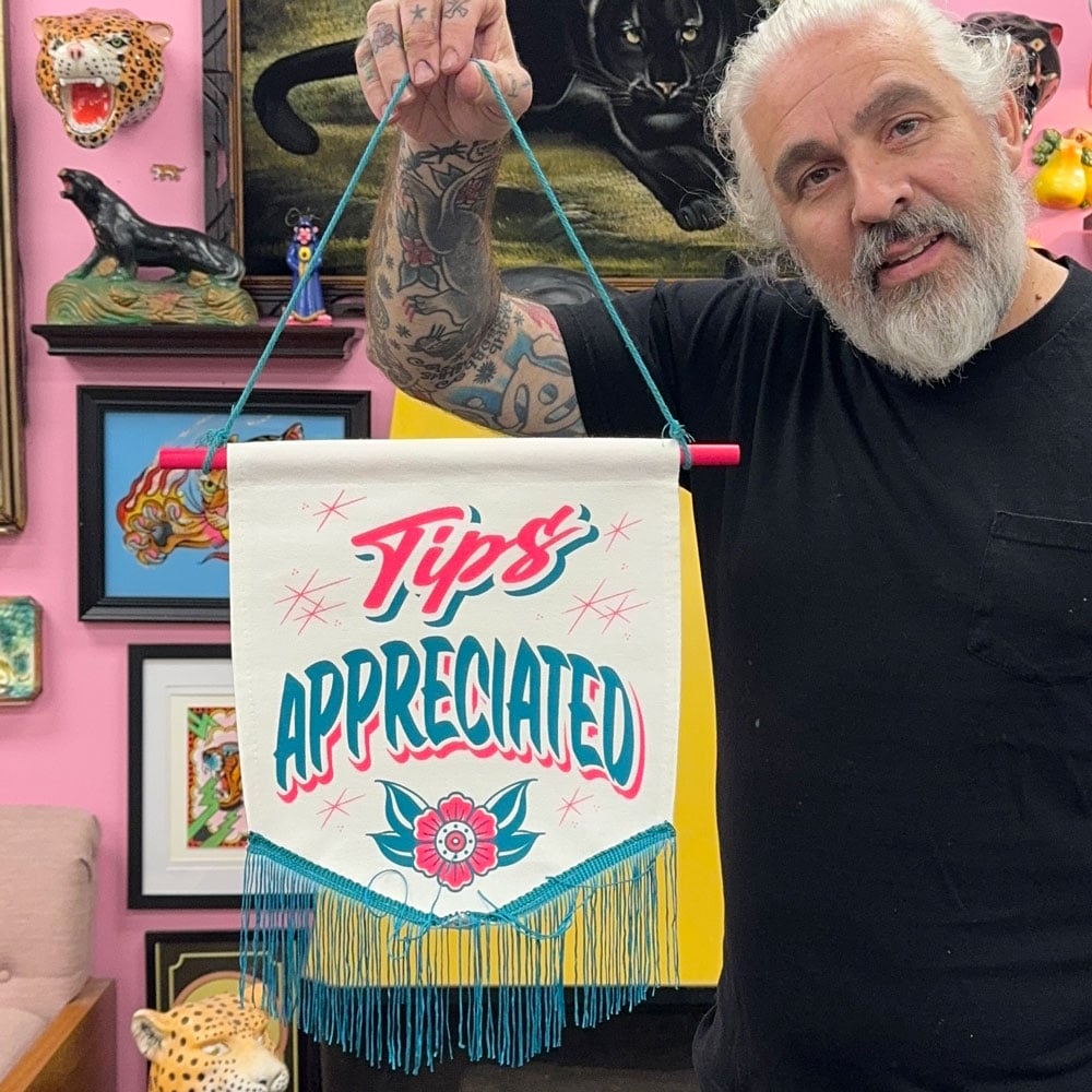 Tips Appreciated Pennant. Screen printed on canvas w/ fringe Pennant and fringe approx. 10.5x16.5" + Rod, hanging rope & tassels